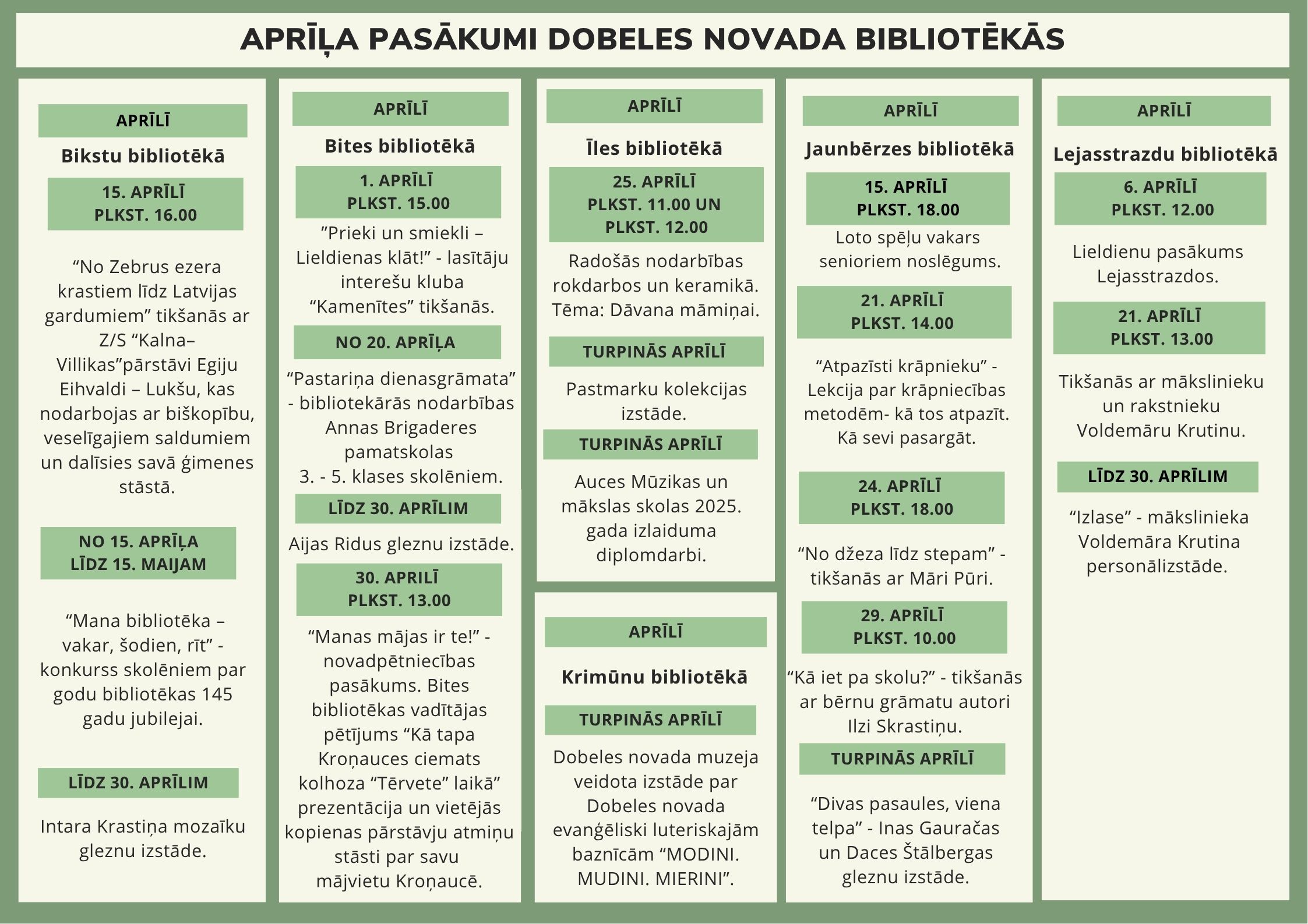 APRĪĻA PASĀKUMI DOBELES NOVADA BIBLIOTĒKĀS 01.04.2026