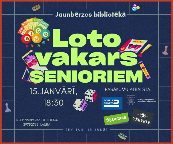 Jau otro gadu pēc kārtas Jaunbērzes bibliotēka ar prieku aicina seniorus uz iemīļotu un sirsnīgu loto spēļu vakaruturnīru. Tas būs vakars, kurā atkal tiekamies, sanākam jautrā kompānijā, baudām tēju un cepumus un kopā izbaudām loto spēles azartu.