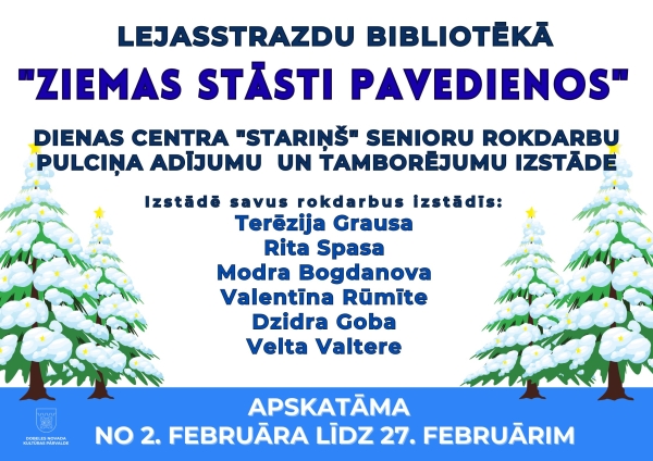 Lejasstrazdu bibliotēka No 2. februāra līdz 27. februārim aicina iegrimt sirsnīgos, rūpīgi darinātos un stāstiem bagātos rokdarbu pasaules rakstos. Dienas centra Stariņš senioru rokdarbu pulciņš ir sarūpējis īpašu adījumu un tamborējumu izstādi Ziemas stāsti pavedienos, kurā katrs darbs ir kā mazs personisks notikums, tā ir atmiņa, sajūta vai dzīves mirklis, iemūžināts pavedienu ritmā.