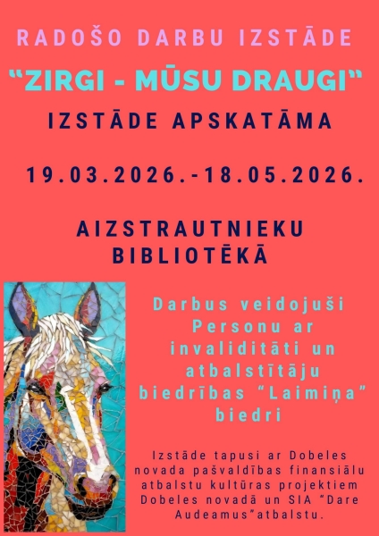 No 19. marta līdz 18. maijam Aizstrautnieku bibliotēkā būs apskatāma Personu ar invaliditāti un atbalstītāju biedrības Laimiņa radošo darbu izstāde Zirgi mūsu draugi. Izstāde tapusi ar Dobeles novada pašvaldības kultūras projektu finansējuma un sociālā uzņēmuma SIA Dare Audeamus atbalstu.