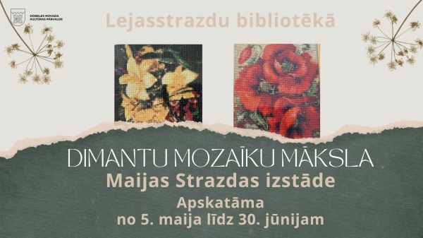 Lejasstrazdu bibliotēka maijā un jūnijā aicina iepazīt Maijas Strazdas izstādi “Dimanta mozaīku māksla”. Izstāde ir pacietības, radošuma un gaismas spēles apvienojumu.