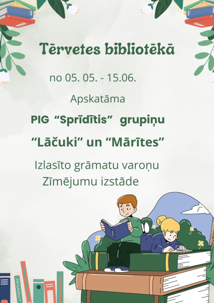 Ik gadu Tērvetes bibliotēkai sadarbojoties ar pirmsskolas izglītības grupu Sprīdītis, bērniem tiek iedotas dažāda satura grāmatas, lai katrs bērns izvēlas sev tīkamāko, izlasa to, pēc tam uzzīmē savu grāmatas mīļāko varoni.