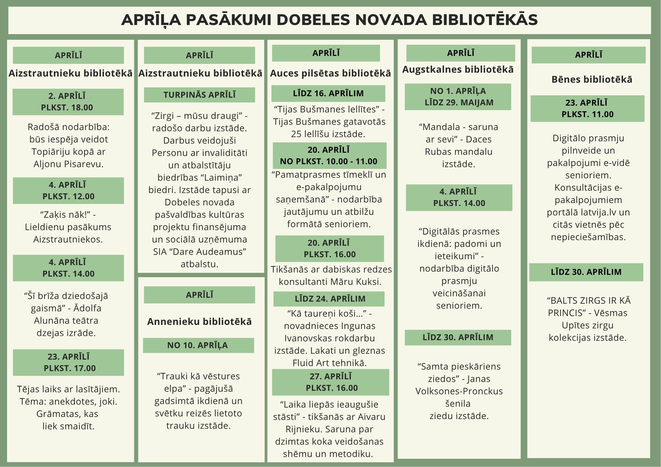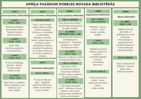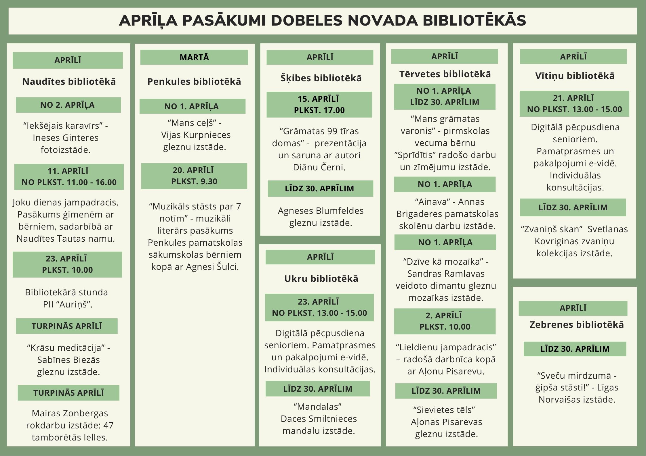 APRĪĻA PASĀKUMI DOBELES NOVADA BIBLIOTĒKĀS 01.04.2026
