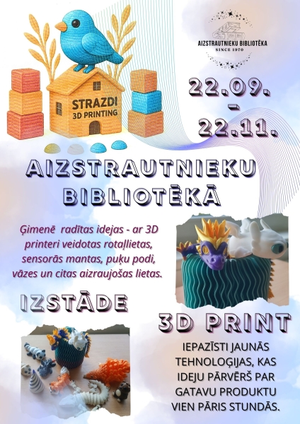 No 22. septembra līdz 22. novembrim Aizstrautnieku bibliotēkā apskatāma izstāde, kurā var iepazīties ar ģimenes uzņēmuma "Strazdi 3D PRINT" veidotajiem darbiem.