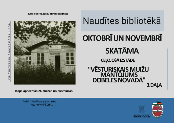 Oktobrī un novembrī Naudītes bibliotēkā būs apskatāma izstāde “Vēsturiskais muižu mantojums Dobeles novadā”, ko veidojusi nevalstiskā organizācija “Dobeles Vācu kultūras biedrība” ar Dobeles novada pašvaldības atbalstu.