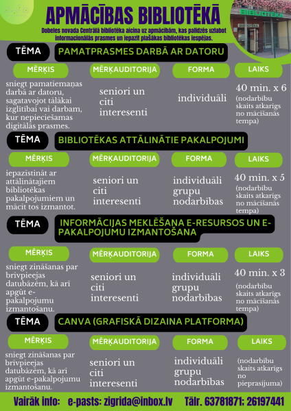 Dobeles novada Centrālā bibliotēka piedāvā apmācību programmas, lai sekmētu iedzīvotāju informacionālo prasmju uzlabošanos un veicinātu plašāku bibliotēkas pakalpojumu izmantošanu.