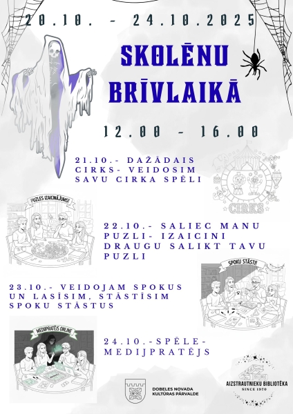 Gatavojieties aizraujošam, radošam un nedaudz spocīgam brīvlaikam no 20. līdz 24. oktobrim! Katru dienu no 12:00 līdz 16:00 aicinām uz Aizstrautnieku bibliotēku, lai piedalītos aizraujošās aktivitātēs!