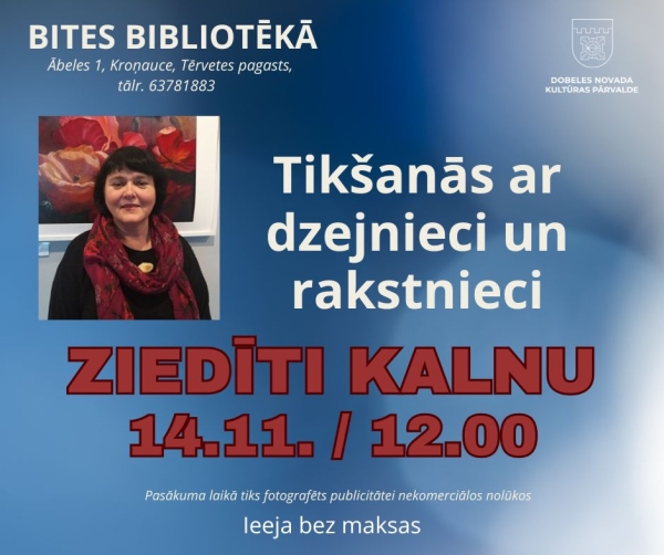 Latvijas dzimšanas dienas priekšvakarā, 14. novembrī pulksten 12.00, Bites bibliotēka aicina savus lasītājus uz tikšanos ar dzejnieci un rakstnieci Ziedīti Kalnu.