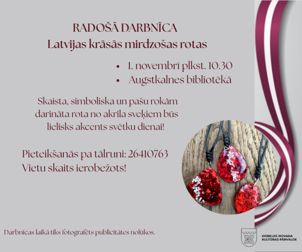 1. novembrī plkst. 10.30 Augstkalnes bibliotēkā notiks radošā darbnīca "Latvijas krāsās mirdzošās rotas", kurā dalībnieki veidos rotas Latvijas karoga krāsās no akrila sveķiem. Pasākuma mērķis ir rosināt svētku noskaņu un radošu kopā būšanu, gatavojoties Latvijas valsts svētkiem.
