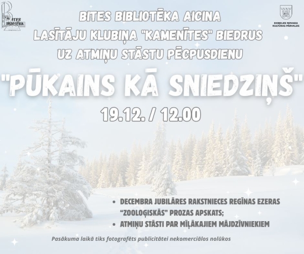 Bites bibliotēka ielūdz lasītāju interešu kluba Kamenītes biedrus uz tikšanos š.g. 19. decembrī plkst. 12.00.