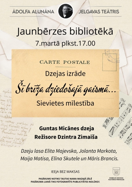 Ir tādi vārdi, kuri skan cauri dzīvei - caur mēnešiem, dienām un gadiem. Ādolfa Alunāna Jelgavas teātra dzejas izrādē “Šī brīža dziedošajā gaismā… (Sievietes mīlestība)” pavadiet stundu ar Guntas Micānes dzeju, kas skan kā mīlestības vēstules mūža garumā.