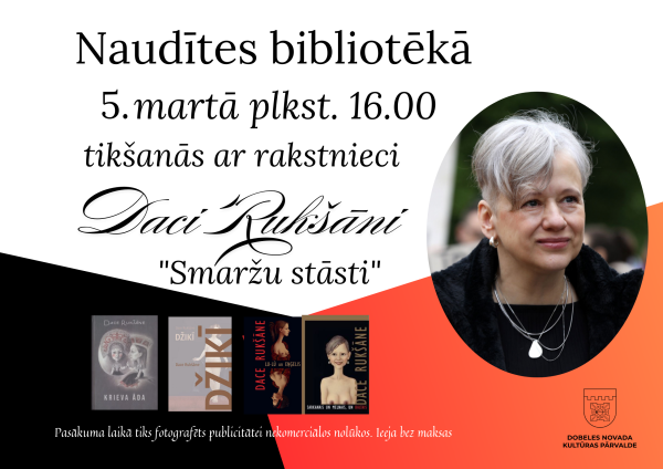 Naudītes bibliotēka aicina uz tikšanos ar rakstnieci Daci Rukšāni- Ščipčinsku, kas notiks 5. martā plkst. 16.00 Naudītes bibliotēkas telpās.