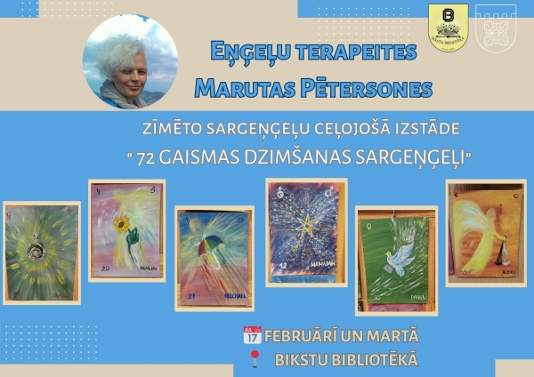 Februārī un martā Bikstu bibliotēkā apskatāma gleznu izstāde “72 gaismas dzimšanas sargeņģeļi” un Marutas Pētersones grāmata “72 gaismas dzimšanas sargeņģeļi”.