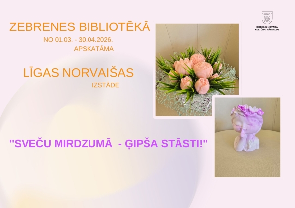 No 2026. gada 1. marta līdz 30. aprīlim Zebrenes bibliotēka aicina apmeklētājus uz Līgas Norvaišas radošo darbu izstādi “Sveču mirdzumā ģipša stāsti!”.