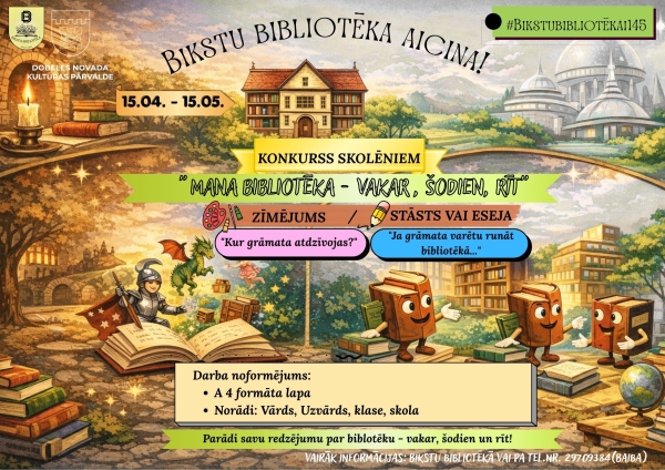 Par godu Bikstu bibliotēkas 145 gadu jubilejai no 15. aprīļa līdz 15. maijam tiek organizēts radošais konkurss skolēniem “Mana bibliotēka – vakar, šodien, rīt”.