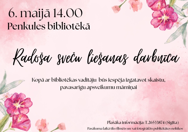 6. maijā plkst. 14.00 Penkules bibliotēkā bērni un jaunieši aicināti kopā radīt īpašas, pašu darinātas sveces siltas, smaržīgas un pilnas mīlestības. Tā būs lieliska iespēja pavadīt laiku radošā gaisotnē un sagatavot skaistu dāvanu Māmiņdienai.
